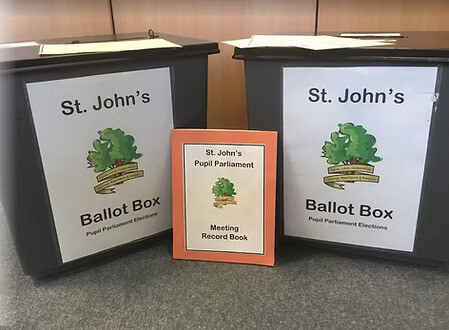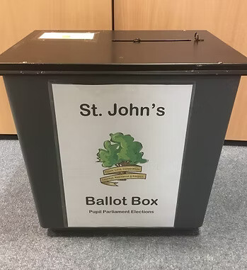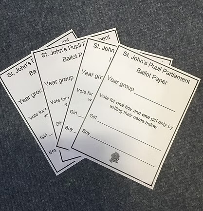 Living the British Value of Democracy, the process of being elected at St. John’s begins by putting a speech together to explain why they would like to be part of Pupil Parliament and the differences they would make. After hearing their candidates, each class visits the voting booths in the hall to cast their vote.