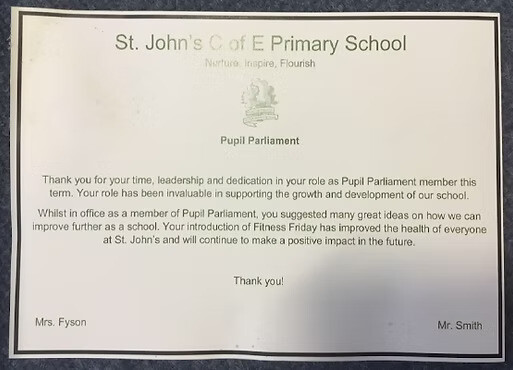 Pupil Parliament has a fundamental role in helping St. John’s flourish and, each month, meet to review, share thoughts and suggest ways St. John’s can become even better!